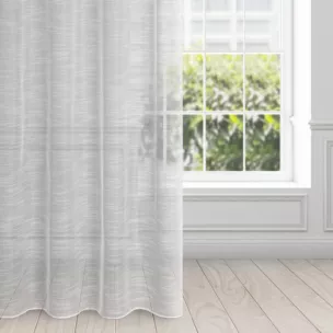 Firana RACHEL to połączenie stylu eko z nutką stylu glamour. Firanę zaprojektowano z tkaniny w poziome prążki wykonane grubszą nicią na delikatnie lśniącym tle.  Nasza propozycja jest wspaniałym uzupełnieniem wnętrz w stylu rustykalnym, skandynawskim czy eko. Struktura tkaniny dobrze kryje okno,  chroniąc wnętrze przed nadmiarem  promieni słonecznych. Praktyczne przelotki nadają dekoracji okiennej nowoczesnego charakteru, układając tkaninę w miękkie i regularne fale.  Idealnie dopasuje się do okna w Twojej sypialni, jadalni czy salonie. Znakomicie prezentuje się sama, ale nic nie stoi na przeszkodzie, aby dobrać do niej zgodne ze stylem wnętrza zasłony.
