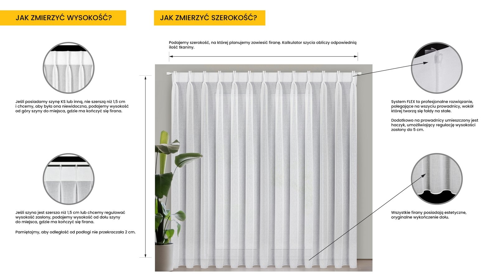 Pamiętaj, aby w kalkulatorze wpisać rozmiar firany na gotowo, czyli na szerokość, którą chcesz przysłonić.
