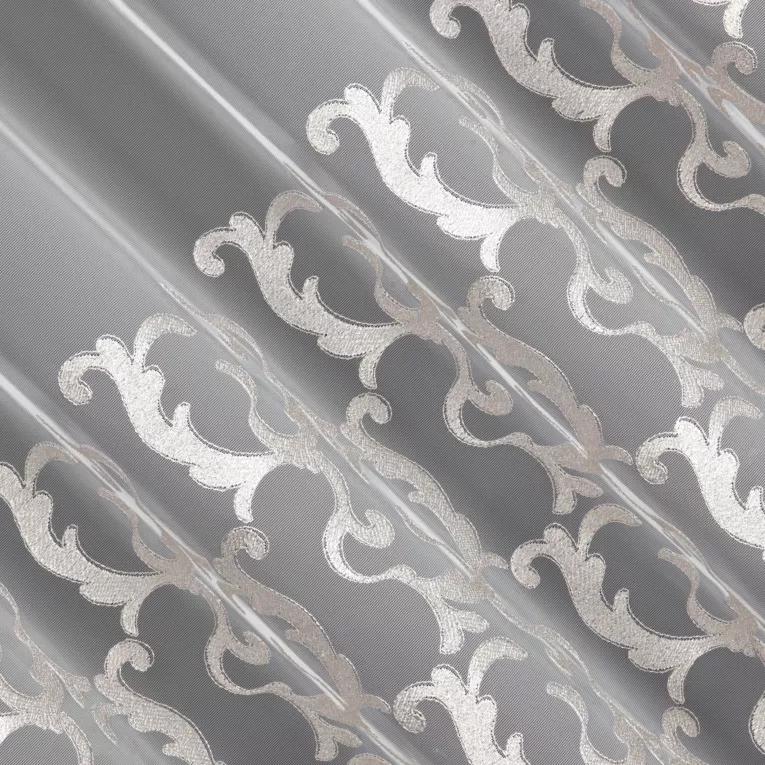 Gładka, matowa mikrosiateczka w kolorze białym zdobiona w dolanej części szerokim pasem ornamentowego haftu w odcieniu złota. Znakomicie prezentuje się, zarówno solo, jak i w towarzystwie dobranych zasłon. Ta firana to stylowy dodatek wpływający na wizualne ocieplenie wnętrza i zjawiskowo zdobiąca okno. Pięknie zaprezentuje się w jasnym salonie lub słonecznej sypialni. Tkanina o przezroczystej strukturze, zapewnia wnętrzu wiele naturalnego światła, dlatego będzie odpowiednia szczególnie do mało nasłonecznionych pomieszczeń, które chcemy doświetlić słonecznym światłem. Pięknie zaprezentuje się w we wnętrzu klasycznym, we wnętrzu w stylu retro czy typowo romantycznej stylizacji. Firana wykończona jest dołem w formie delikatnej fali.