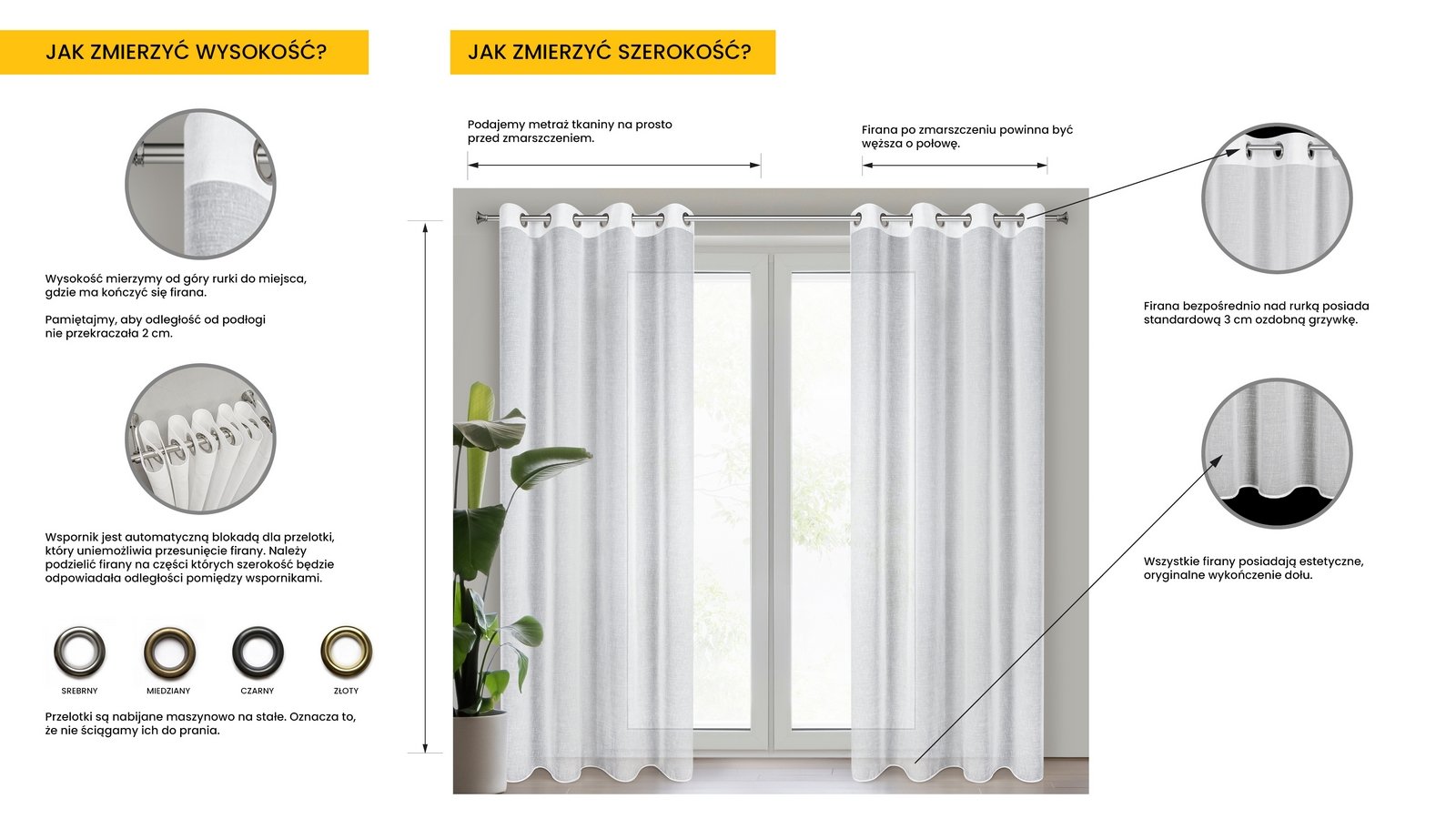 Wysokość: zmierz od górnej krawędzi karnisza (rurki) do miejsca zakończenia dekoracji (czyli podłogi lub parapetu) i odejmij 0,5-2 cm.