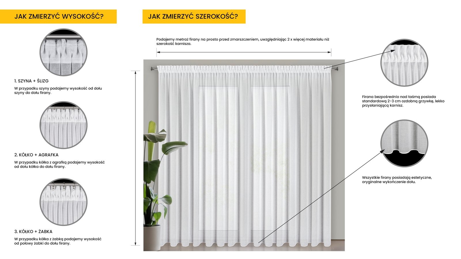 Szerokość: ustal szerokość, jaką ma przysłonić firana i dodaj około 100%. Ten wymiar wybierz w kalkulatorze. Dzięki temu uzyskasz równomierne zmarszczenie tkaniny, efektownie prezentujące się w świetle okna.