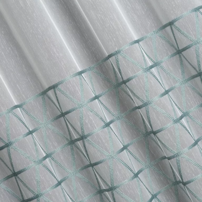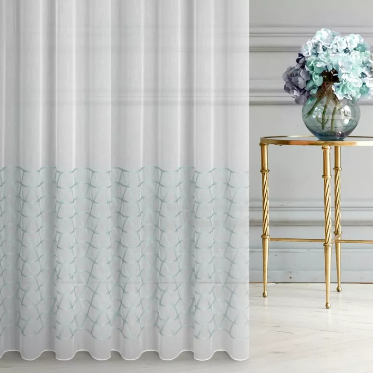 Firana szyta na taśmie fala kremowo turkusowa z miękkiej takniy z haftowanym, geometrycznym wzorem