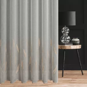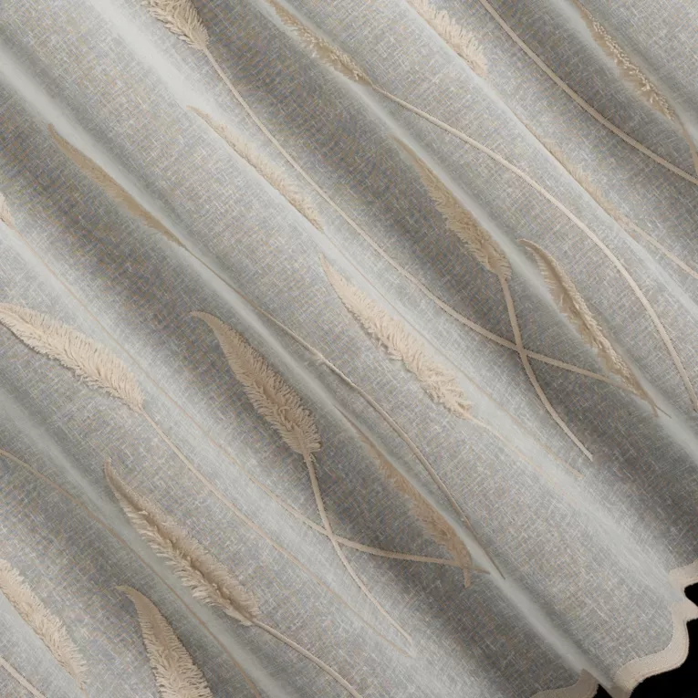Matowa etamina z roślinnym haftem to efektowna dekoracja pasująca zarówno do klasycznych, jak i nowoczesnych wnętrz. Tkanina w kolorze naturalnym z beżowym haftem w postaci trawy pampasowej wizualnie ociepla wnętrze. Firana pięknie układa się w świetle okna w towarzystwie dobranych do całości aranżacji zasłon. Wysokiej jakości tkanina jest bezpieczna i łatwa w konserwacji, a jej dużym atutem jest łatwość prasowania. Materiał o gęstej strukturze dobrze kryje okno, polecany jest szczególnie do pomieszczeń, o dużej ekspozycji słonecznej. Szew obciążający wszyty w dolnej części tkaniny gwarantuje piękne układanie się firany po zawieszeniu na karniszu.