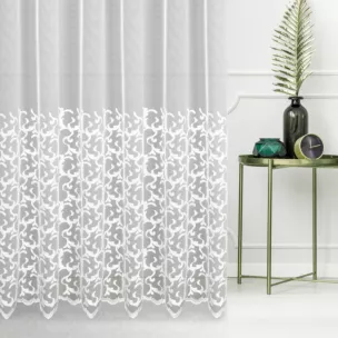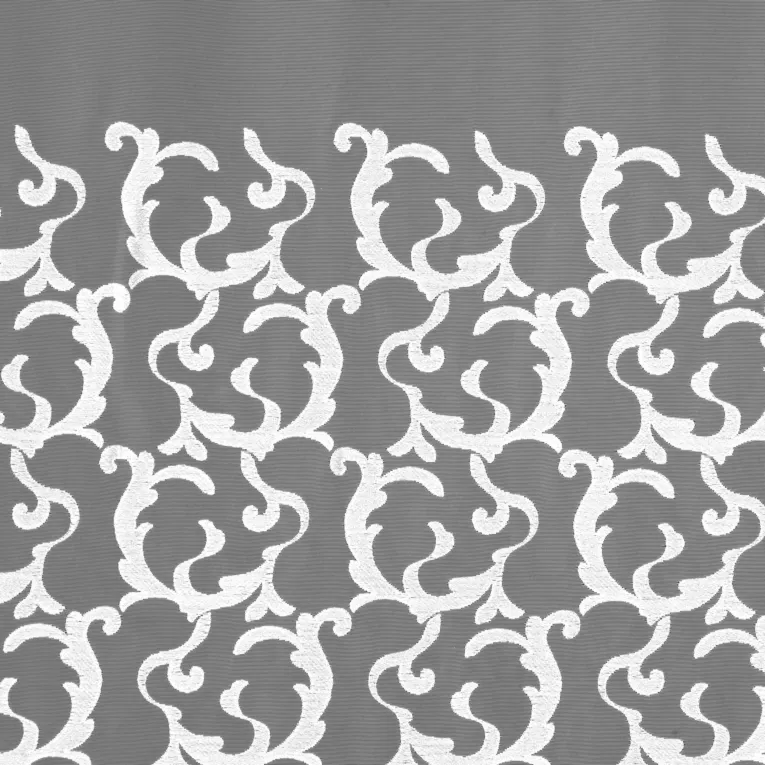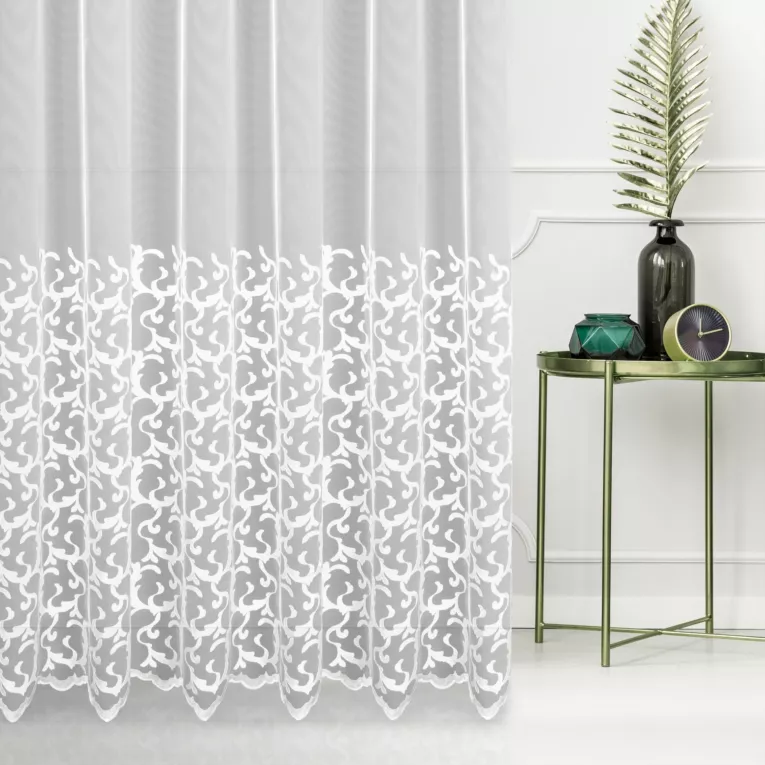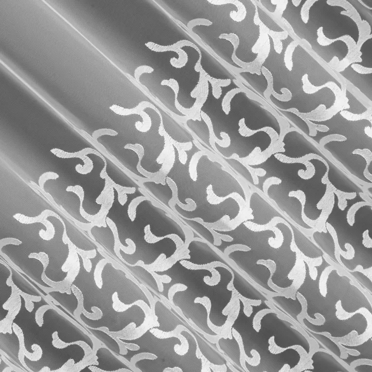 Gładka, matowa mikrosiateczka w kolorze białym zdobiona w dolanej części szerokim pasem ornamentowego haftu. Znakomicie prezentuje się, zarówno solo, jak i w towarzystwie dobranych zasłon. Ta firana to stylowy dodatek wpływający na wizualne ocieplenie wnętrza i zjawiskowo zdobiąca okno. Pięknie zaprezentuje się w jasnym salonie lub słonecznej sypialni. Tkanina o przezroczystej strukturze, zapewnia wnętrzu wiele naturalnego światła, dlatego będzie odpowiednia szczególnie do mało nasłonecznionych pomieszczeń, które chcemy doświetlić słonecznym światłem. Pięknie zaprezentuje się w we wnętrzu klasycznym, we wnętrzu w stylu retro czy typowo romantycznej stylizacji. Firana wykończona jest dołem w formie delikatnej fali.