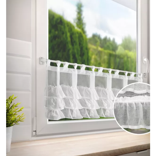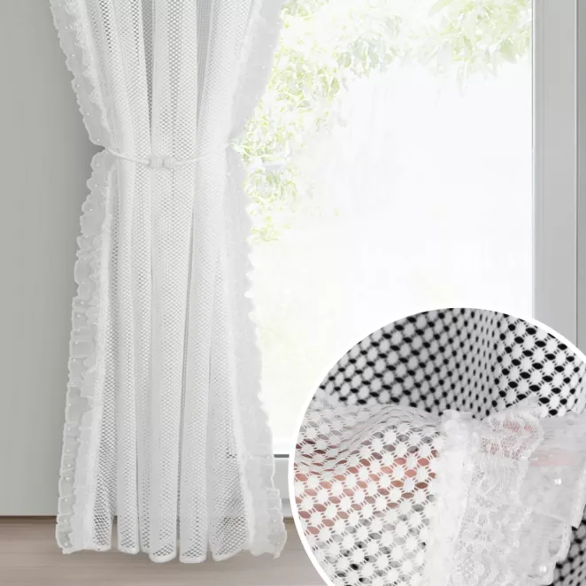 14. Firana biała z siateczki zdobiona na brzegach subtelną falbanką 140x270 cm taśma AGNESS