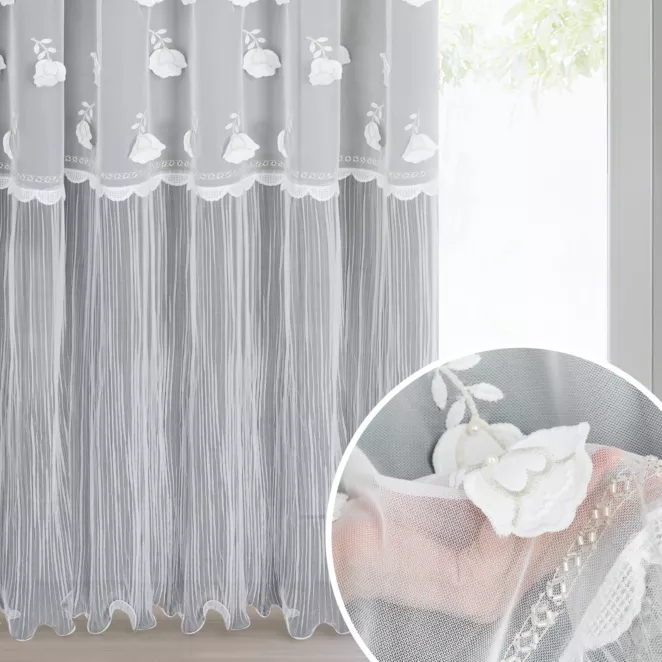 19. Firana biała z siateczki zdobiona aplikacją 3D w róże 140x250 cm przelotka - ROSES3 - Eva Minge