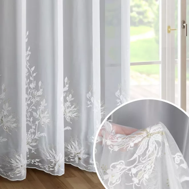 13. Firana biała z szyfonu zdobiona aplikacją 3D w róże 350x250 cm przelotka - ROSES - Eva Minge
