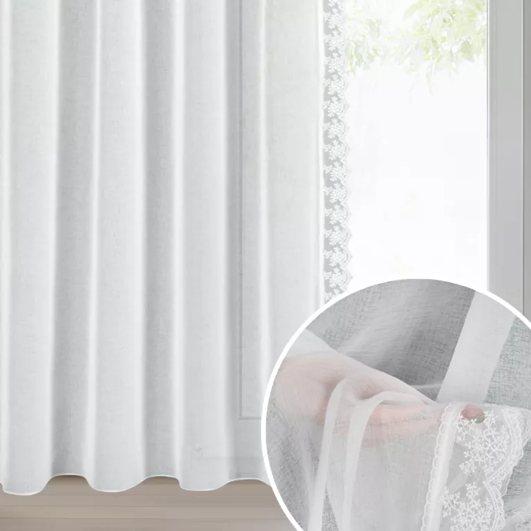 Obie firany zostały ozdobione subtelną koronką, co dodaje im dekoracyjnego, subtelnego charakteru. To idealna propozycja do salonu, sypialni, jadalni czy pokoju dziecięcego.