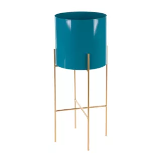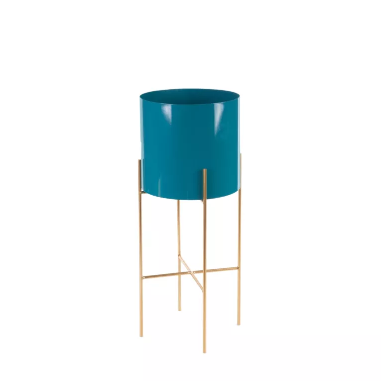Nowoczesne dodatki do wnętrz, czynią wnętrza piękniejszymi i bardzo przytulnymi. Metalowa osłonka na donicę na stojaku to idealny dodatek do salonu, sypialni, na taras lub balkon. Świetnie prezentuje się zarówno w nowoczesnych, jak i w klasycznych wnętrzach. Złoty stelaż z metalowymi prętami o ascetycznym kształcie, w zestawieniu z kontrastującą turkusową osłonką na donicę, tworzą razem kompozycję w niezwykle oryginalnym stylu. Idealnie podkreśli urok zielonej rośliny. Idealna na kwiat monstery, efektowną paproć lub inną ulubioną roślinę.