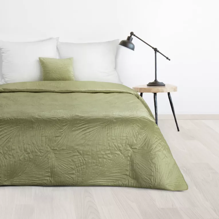 Narzuta welwetowa jasnozielona 220x240 cm pikowana metodą hot press we wzór liści palmy LUIZ Design 91