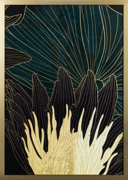 Obraz z nadrukiem liści i kwiatów w złotej ramce