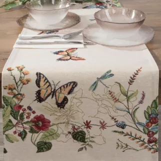 Szukasz  wzorów, które pięknie zaprezentują się we wnętrzu? Obrus gobelinowy  wykonany z grubej tkaniny ozdobiony wzorem letnich kwiatów i motyli inspirowany stylem folk, to dekoracja dodająca stylu  wnętrzu. Grubsza żakardowa tkanina gwarantuje piękny efekt dekoracyjny, a uzyskany techniką tkania wzór sprawia, że obrus  pięknie się prezentuje zarówno we wnętrzu w stylu rustykalnym, jak i w nowoczesnej stylizacji retro czy folk. Wysoka jakość oraz staranne wykonanie gwarantują satysfakcję z produktu, a  motyw kwiatów i motyli znakomicie ożywia wnętrze, wprowadzając do aranżacji świeżość i radosny nastrój.
