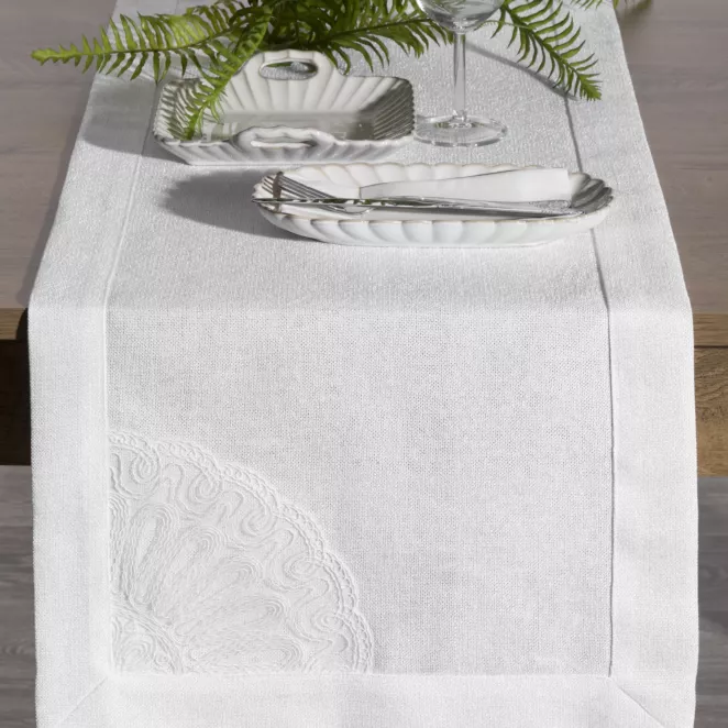 3. Bieżnik na stół biały 40x180 cm Emily z ozdobną listwą i mereżką
