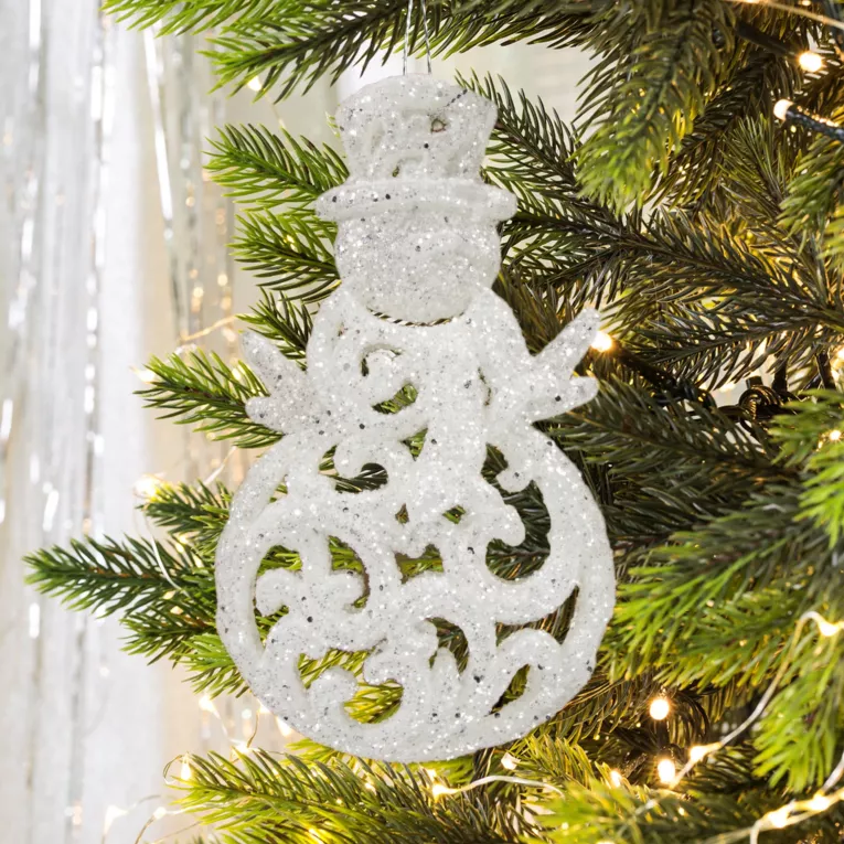 Ozdoba choinkowa -  ażurowy BAŁWANEK, obsypana iskrzącym brokatem, to efektowny dodatek do dekoracji Twojego świątecznego drzewka. Ozdoba pięknie kontrastuje z zielonymi gałązkami choinki. Życzymy, by nadchodzące Święta, za sprawą wyjątkowych dekoracji i ozdób, były czasem niezwykłej  atmosfery w Twoim domu!