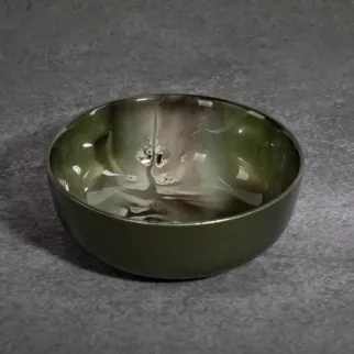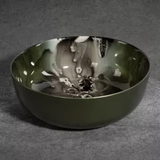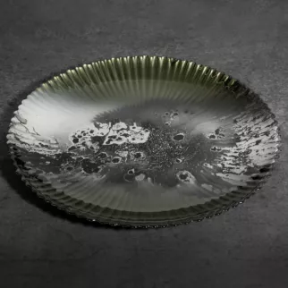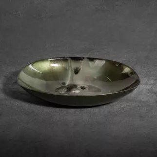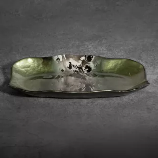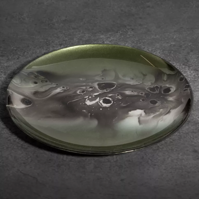Patera ze szkła artystycznego, przyciąga wzrok oryginalnym artystycznym designem. Patera w zielonym kolorze z zielono-stalowym abstrakcyjnym wzorem prezentuje się wyjątkowo stylowo.  Możesz wyeksponować na niej owoce lub słodycze, a wraz z pozostałymi elementami kolekcji stanie się dodatkiem przyciągającym spojrzenia. W nowoczesnym wnętrzu nie może zabraknąć niebanalnych dodatków. Szczerze polecamy pozostałe składniki kolekcji SABA, tworzące niepowtarzalną atmosferę wnętrza. Produkt bezpieczny w kontakcie z żywnością.