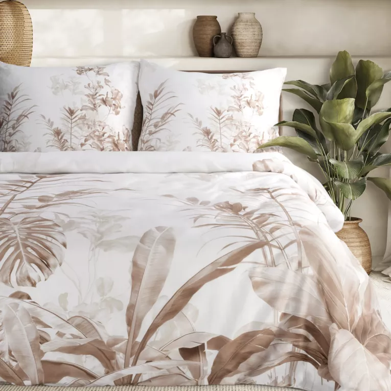Pościel 140x200 cm z satyny bawełnianej kolor biało, brązowy z motywem egzotycznych liści Eurofirany Premium