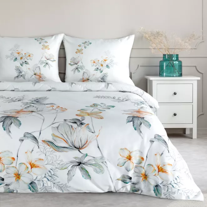 26. Pościel 160x200 cm z makosatyny bawełnianej kolor oliwkowo, biały zdobiona nadrukiem kwiatów REINA 43