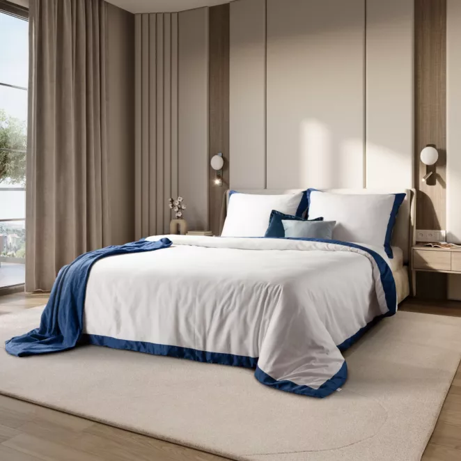 21. Pościel 160x200 cm z makosatyny bawełnianej kolor biały, granatowy z motywem geometrycznym REINA 49 - kolekcja TOLEDO