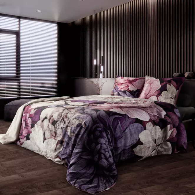 32. Pościel 220x200 cm z makosatyny bawełnianej kolor pudrowy, fioletowy z motywem kwiatów REINA 51 - kolekcja AMAROSA