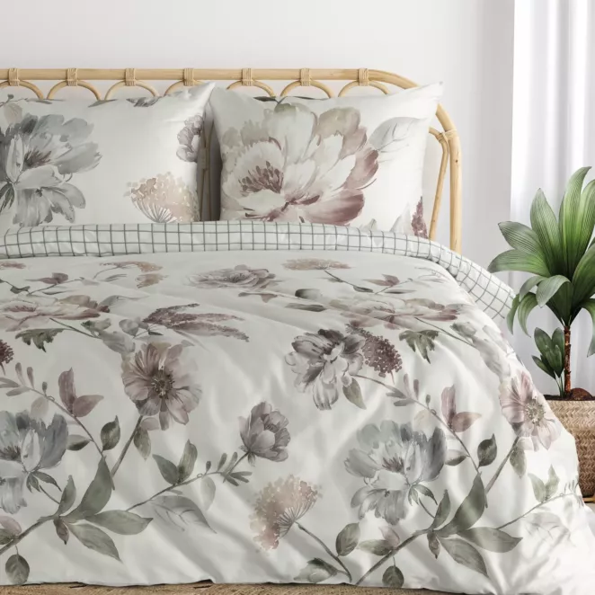 1. Pościel dwustronna 160x200 cm satyna bawełniana kolor biały, szarobeżowy z motywem kwiatów Eurofirany Premium