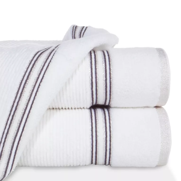 Ręcznik FILON podkreślony bordiurą z błyszczącą nitką, to  łazienkowy dodatek podkreślający styl każdej eleganckiej łazienki. Delikatne prążki pokrywają całą jego powierzchnię, a jego część ozdobna tworzą proste pasy wzbogacone srebrną nicią. Wyjątkową miękkość i puszystość ręcznika zapewnia wysokiej jakości bawełna użyta do jego produkcji. Kolekcja ręczników FILON obejmuje wiele kolorów w dwóch rozmiarach, dzięki czemu łatwo jest skompletować zestaw. W ramach kolekcji dobieraj i zestawiaj dowolne kolory i rozmiary, dopasowując zestaw do indywidualnych potrzeb. Serdecznie polecamy!