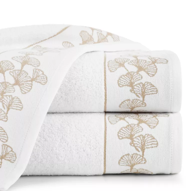 Ekskluzywny ręcznik z kolekcji BLANCA zdobiony żakardową bordiurą z nowoczesnym motywem liści miłorzębu pięknie wyróżni Twoją łazienkę.  Ręcznik z puszystej bawełny frotte, bardzo delikatnej w dotyku zachwyca miękkością oraz doskonałą chłonnością, która zapewnia szybkie i łagodne osuszenie ciała po kąpieli. Ręczniki dostępne w dwóch rozmiarach sprawiają, że z łatwością możesz stworzyć z nich zestaw. Wybierz kolekcję najwyższej jakości ręczników z naturalnej i miłej dla skóry bawełny podkreślonej bordiurą z  delikatnymi gałązkami. Nie czekaj, już dziś wyróżnij swoją łazienkę  niezwykłymi dodatkami!
