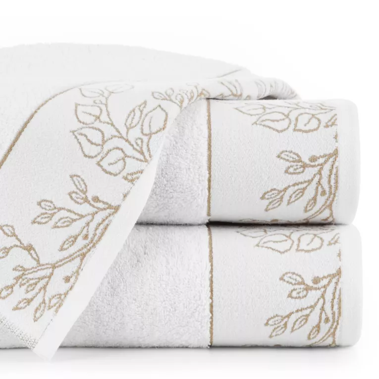 Ekskluzywny ręcznik z kolekcji BLANCA zdobiony żakardową bordiurą z motywem roślinnym, wyróżni Twoją łazienkę.  Ręcznik z puszystej bawełny frotte, bardzo delikatnej w dotyku zachwyca miękkością oraz doskonałą chłonnością, która zapewnia szybkie i łagodne osuszenie ciała po kąpieli. Ręczniki dostępne w dwóch rozmiarach sprawiają, że z łatwością możesz stworzyć z nich zestaw. Wybierz kolekcję najwyższej jakości ręczników z naturalnej i miłej dla skóry bawełny podkreślonej bordiurą z  delikatnymi gałązkami. Nie czekaj, już dziś wyróżnij swoją łazienkę  niezwykłymi dodatkami!
