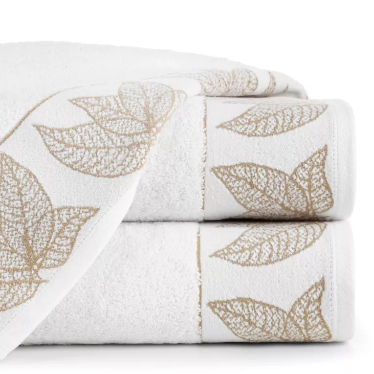 Ekskluzywny ręcznik z kolekcji BLANCA zdobiony żakardową bordiurą z nowoczesnym motywem liści, wyróżni Twoją łazienkę.  Ręcznik z puszystej bawełny frotte, bardzo delikatnej w dotyku zachwyca miękkością oraz doskonałą chłonnością, która zapewnia szybkie i łagodne osuszenie ciała po kąpieli. Ręczniki dostępne w dwóch rozmiarach dają możliwość stworzenia wygodnego zestawu. Wybierz kolekcję najwyższej jakości ręczników z naturalnej i miłej dla skóry bawełny. Nie czekaj, już dziś wyróżnij swoją łazienkę  niezwykłymi dodatkami!