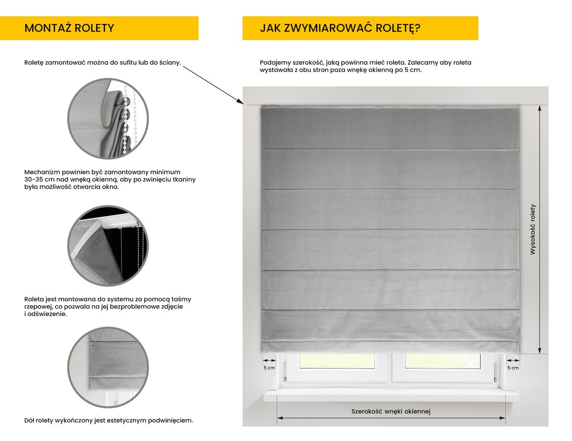 MONTAŻ: Funkcjonalny system pozwala na montowanie rolety do sufitu lub na ścianę w zależności od rodzaju wnętrza i Twoich preferencji. Pamiętaj, aby roleta dobrze się prezentowała, powinna  sięgać ok. 5 cm poza światło okna z każdej strony.