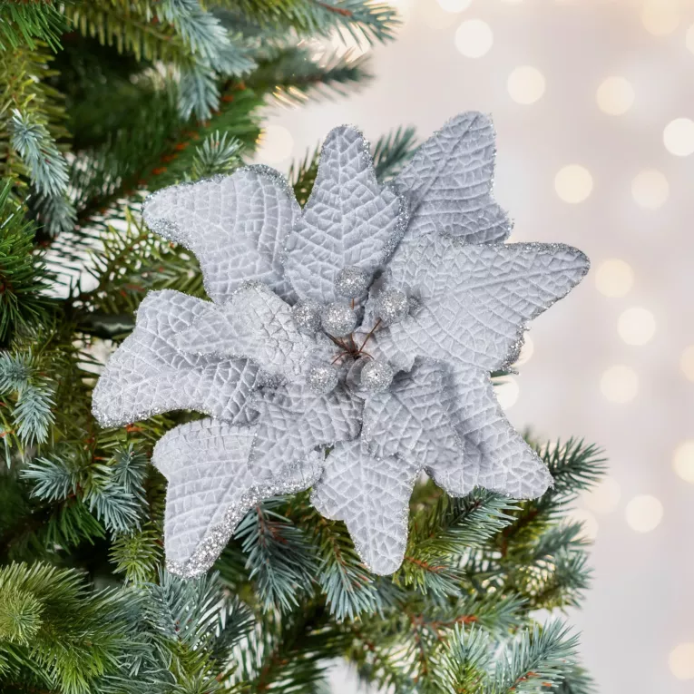 Piękny kwiat dekoracyjny na choinkę to ciekawa dekoracja bożonarodzeniowa. Płatki kwiatu powstały z  tkaniny welwetowej o subtelnym tłoczeniu struktury płatków.  Elegancki kwiat na choinkę doskonale wkomponuje się w każdą niemal aranżację świąteczną. Wszystko zależy bowiem jedynie od wyobraźni. Ten niebanalny, dekoracyjny  kwiat na choinkę pięknie prezentuje się również jako element wieńców, girland, stroików i bukietów świątecznych i zimowych.
