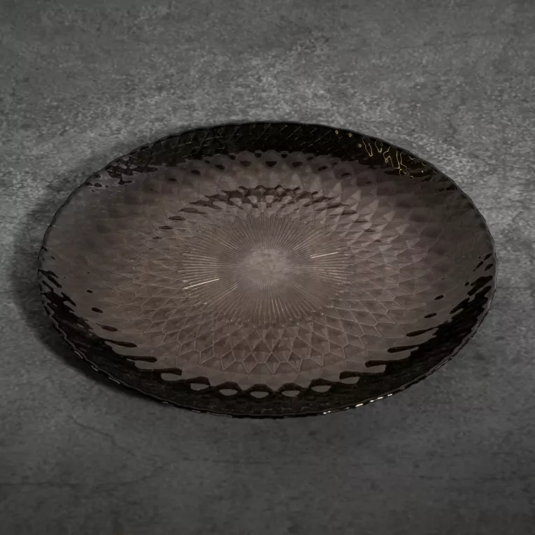 Patera ze szkła artystycznego, przyciąga wzrok oryginalnym artystycznym designem. Patera przezroczystego szkła w grafitowym kolorze z geometrycznym wzorem prezentuje się wyjątkowo stylowo.  Możesz wyeksponować na niej owoce lub słodycze, a wraz z pozostałymi elementami kolekcji stworzy harmonijną całość. W nowoczesnym wnętrzu nie może zabraknąć niebanalnych dodatków. Szczerze polecamy pozostałe składniki kolekcji PALERMO, tworzące niepowtarzalną atmosferę wnętrza.