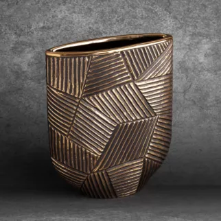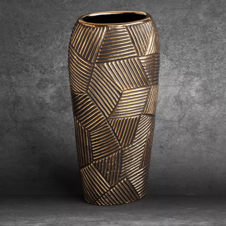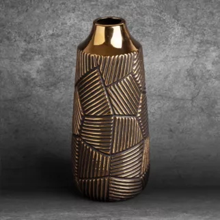 Ceramiczny wazon dekoracyjny z kolekcji EMMI o prostym  kształcie, to elegancki dodatek od którego trudno oderwać wzrok. Oryginalny wazon ceramiczny  - czarno-złoty, z wytłaczanym geometrycznym wzorem to elegancki i ponadczasowy detal świetnie sprawdzający się w nowoczesnym wnętrzu. Wazon ceramiczny EMMI to element dekoracyjny w którym przechowasz sztuczne lub naturalne kwiaty. Koniecznie zapoznaj się z pozostałymi elementami tej niezwykłej kolekcji  i stwórz komplet dostosowany do Twoich potrzeb. Dodaj wnętrzu szyku - gwarantujemy, że obok takich dodatków nikt nie przejdzie obojętnie.