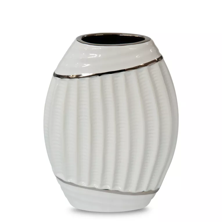 Niezwykłe dodatki sprawiają, że każde wnętrze nabiera stylu i wyrazu. Ascetyczny w wyrazie wazon ceramiczny w formie owalnym zaskakuje  prostotą formy. Biało-srebrny wazon dekoracyjny o nowoczesnym kształcie, to dodatek,  który elegancko zaprezentuje się na Twoim stole, komodzie badź tarasie. Biała barwa i prosta, geometryczna forma znakomicie pasuje do wystroju nowoczesnej aranżacji wnętrza. Zapoznaj się z pozostałymi elementami kolekcji, które dopełnią dekoracji wnętrza.