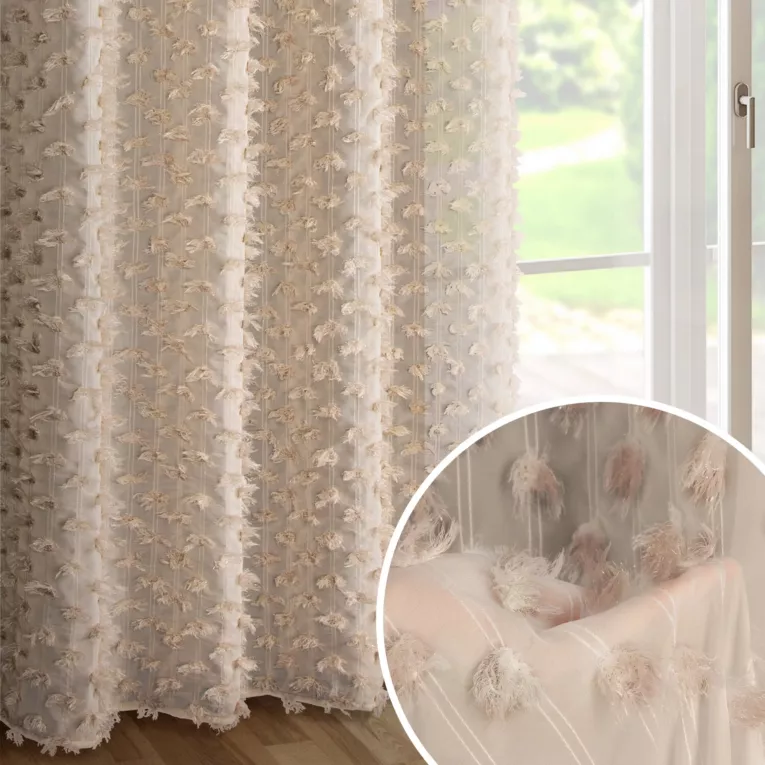 Zasłona beżowa zdobiona pomponami z szyfonu 135x250 przelotka - AURELIA - Eva Minge