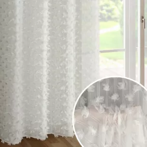 Zasłona gotowa AURELLA z kolekcji Eva Minge, wykonana z lekkiej i zwiewnej tkaniny szyfonowej, to wyjątkowy element dekoracyjny, który łączy nowoczesny styl z elegancją. Zdobiona designerskim wzorem pomponów, dodaje wnętrzu oryginalności i subtelnej gry faktur. Delikatna błyszcząca nić, wpleciona w pompony, nadaje zasłonie lekki połysk, który pięknie odbija światło, podkreślając wyrafinowany charakter projektu. Zasłona jest wyposażona w przelotki, co ułatwia montaż i przesuwanie materiału po karniszu, a także gwarantuje eleganckie układanie się w miękkie fałdy. To doskonały wybór dla osób ceniących luksusowe i niebanalne wzory w wystroju wnętrz.