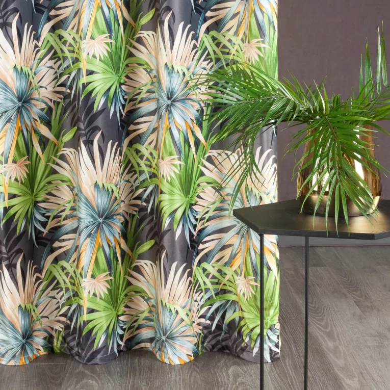 Miękka i delikatna w dotyku zasłona z przyjemnej welwetowej tkaniny, którą zdobi nadruk egzotycznych liści w niezwykłej  kolorystyce na ciemnym, grafitowym tle dodatek świetnie pasujący do nowoczesnych wnętrz. Kontrastujące kolory naniesione na miękką tkaninę  tworzą niezwykłą kompozycję dedykowaną modnym wnętrzom.  Praktyczne przelotki sprawiają, że zmiana dekoracji trwa tylko krótką chwilę, a tkanina pięknie się prezentuje po zawieszeniu na karniszu. Grubsza tkanina świetnie izoluje światło słoneczne zapewniając przyjemny klimat we wnętrzu. Uwaga: tkanina posiada nadruk tylko z jednej strony, druga strona jest w kolorze białym. Nie czekaj - już dziś odśwież swoje wnętrze i dodaj mu koloru!
