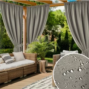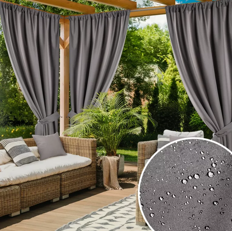 Wytrzymała  tkanina tworzy komfortową strefę cienia w miejscu wypoczynku, jednocześnie zapewniając prywatność i chroniąc przed oczami sąsiadów. Szerokość zasłony to aż 155 cm, co pozwala na szczelne i komfortowe osłonięcie altany. Nowoczesny wygląd sprawia, że sprawdzi się w każdym typie altany, a praktyczna szarfa o długości 145 cm, dostępna w komplecie, daje możliwość efektownego podwiązania miejsca relaksu. Wodoodporna tkanina o niezwykłych właściwościach chroni przed deszczem, wilgocią, promieniowaniem słonecznym oraz wiatrem.