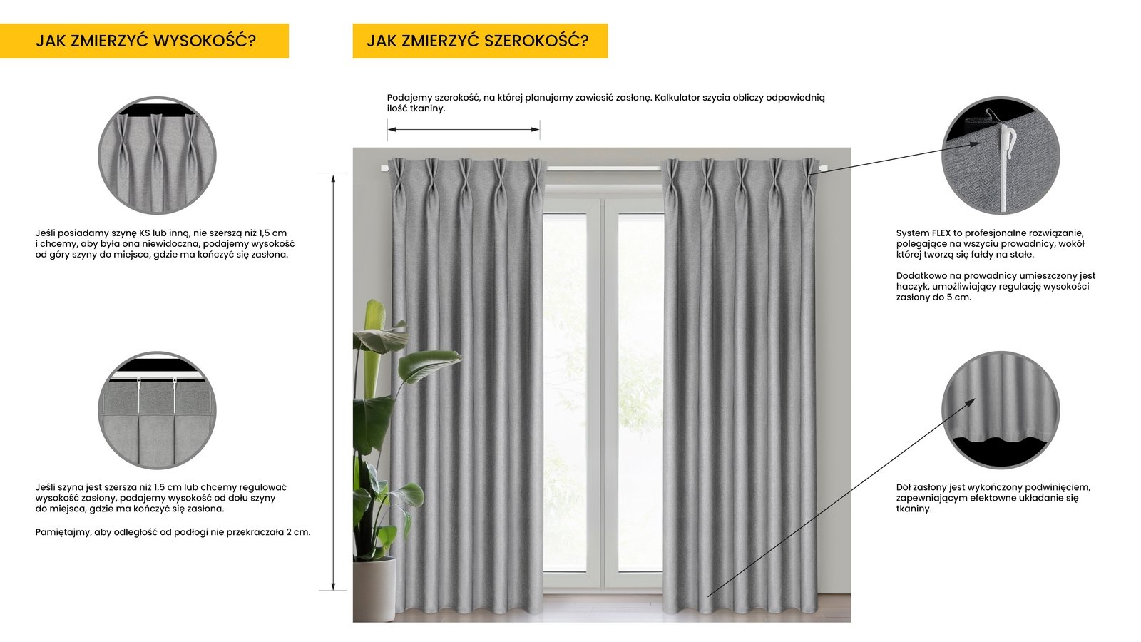 Pamiętaj, aby w kalkulatorze wpisać rozmiar zasłony na gotowo, czyli na szerokość, którą chcesz przysłonić.
