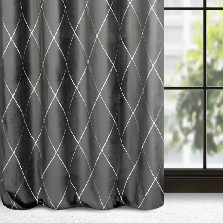 Stylowa zasłona z ekskluzywnej kolekcji PIERRE CARDIN z haftem w formie rombów to elegancki dodatek, który sprawdzi się zarówno w nowoczesnym, jak i w klasycznym wnętrzu.  Zasłona uszyta ze szlachetnego francuskiego welwetu z pewnością zadowoli wielbicielki modnych i eleganckich dodatków.  Taki niewielki akcent odmieni wnętrze salonu, znakomicie uzupełniając dekorację wnętrza. Miękka welwetowa tkanina, którą pokrywa symetryczny haft w postaci regularnych rombów posiada subtelny połyskPraktyczne przelotki sprawiają, że zmiana dekoracji trwa tylko krótką chwilę. Grubsza tkanina świetnie izoluje światło słoneczne zapewniając przyjemny klimat w pomieszczeniu. Jeśli dobierzesz do niej poszewkę  z tej samej kolekcji, zyskasz spójną i atrakcyjną aranżację wnętrza.