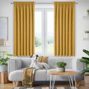 Zasłona DORA to dekoracja, prosta i elegancka, która nie przytłacza wnętrza nadmiarem kolorów i wzorów, a ponadto wyróżnia się subtelną miękkością.  Gładka tkanina o miękkim, zamszowym chwycie wizualnie ociepla i wycisza wnętrze. Jednolity gładki odcień, elegancko otula okno, tworząc subtelne dopełnienie aranżacji wnętrza. Zasłona po zawieszeniu ładnie się układa, tworząc miękkie i regularne fale, delikatnie spływające z karnisza. Materiał o gęstym splocie ogranicza bezpośrednie naświetlenie słoneczne, zabezpieczając również wnętrze przed spojrzeniami z zewnątrz i chroniąc Twoją prywatność. Ze względu na brak przewodniego wzoru i zdobień, tkaninę z łatwością dopasujesz do różnych koncepcji wnętrzarskich. Dobór firany do zasłony DORA nie jest skomplikowany, gdyż większość wzorów prezentuje się w tym zestawieniu atrakcyjnie.