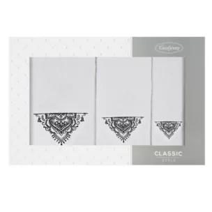 Szukasz pomysłu na prezent, który będzie zarazem praktyczny i piękny? Polecamy zestaw ręczników  zdobionych haftem, zapakowanych w karonowe opakowanie to propozycja na oryginalny prezent. Ręczniki są wykonane w 100% z miękkiej i chłonnej bawełny, przyjemnej w dotyku i trwałej. Wysoka jakość ręczników oraz estetyczne hafty sprawią, że na długie lata pozostaną niezwykłą pamiątką. Zestaw zapakowano w estetyczne kartonowe opakowanie w sam raz na prezent.